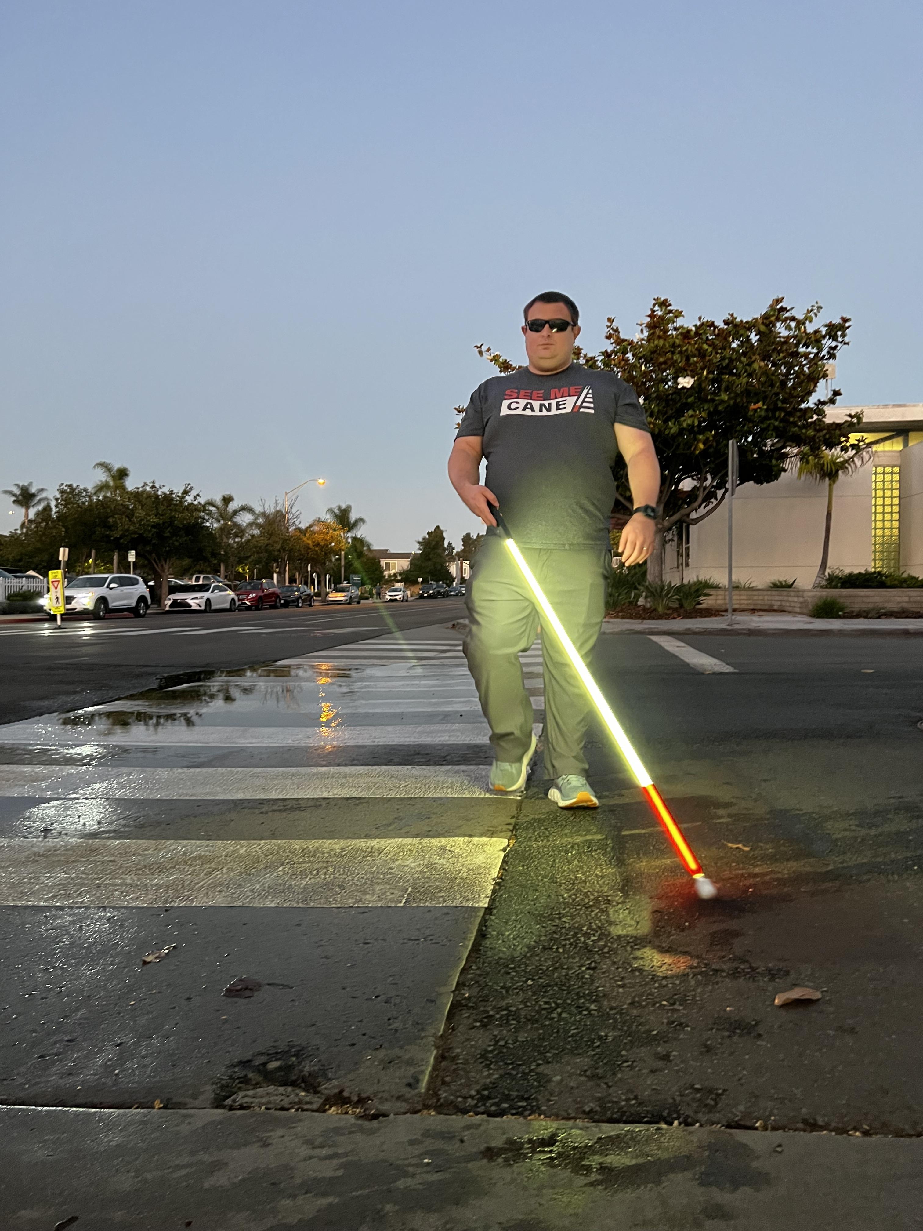 The See Me Cane is designed to increase visibility without changing how a traditional white cane feels or functions.